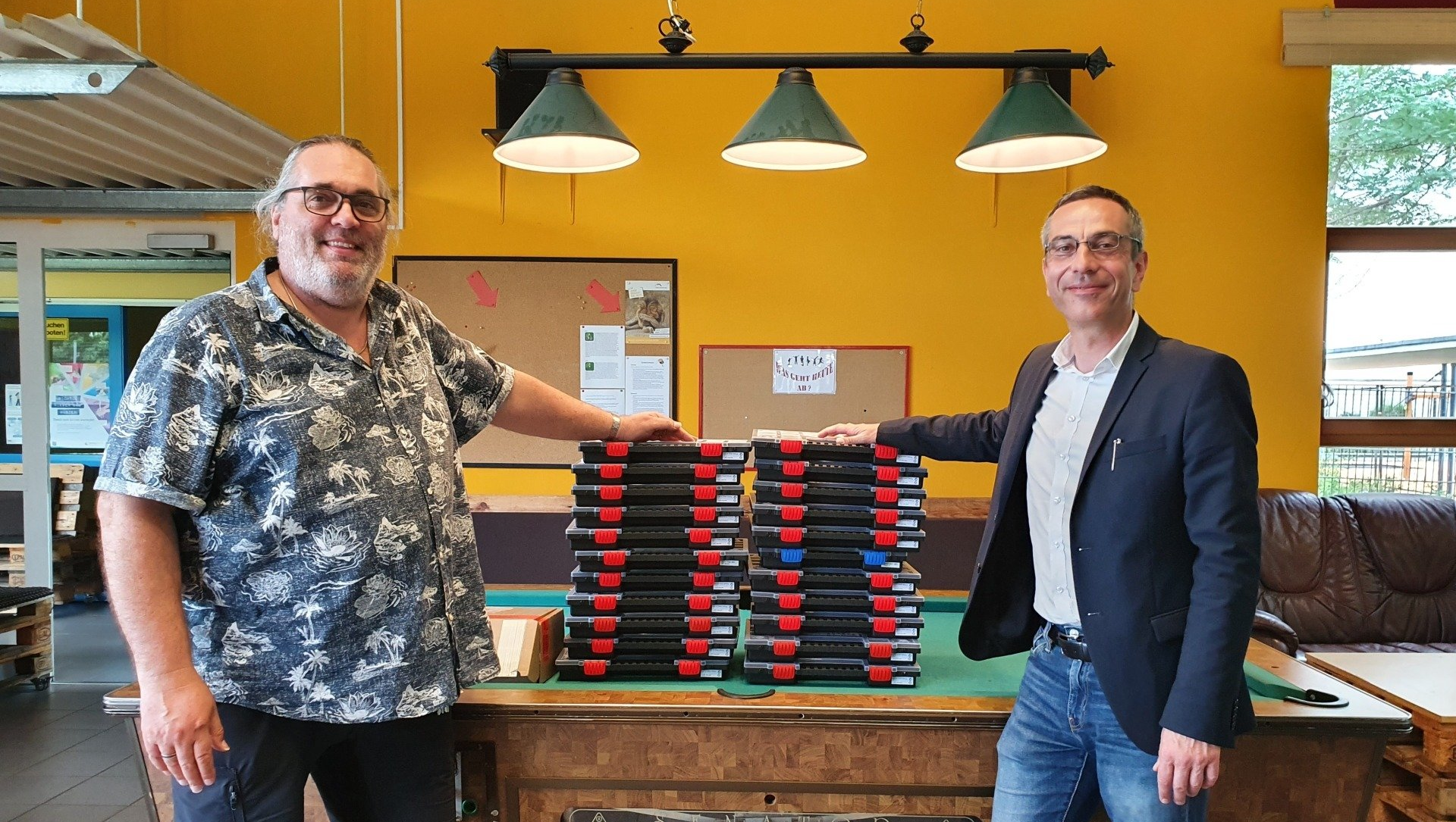 v. l. n. r. Axel Geier (Leiter Ev. Jugendfreizeitstätte Ludwigshafen-Gartenstadt) und Tim Arnheiter bei der Übergabe der Bausätze